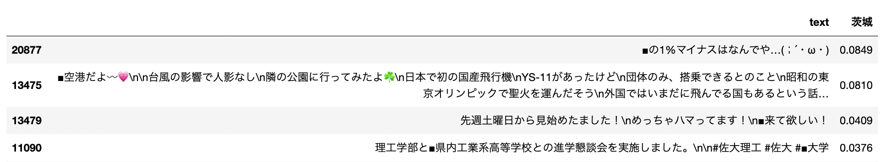 佐賀を茨城と予測した確率上位のツイートを見てみます。(本来は■に佐賀と入っているが、関東に絞った場合に茨城と予測しているツイートです。)