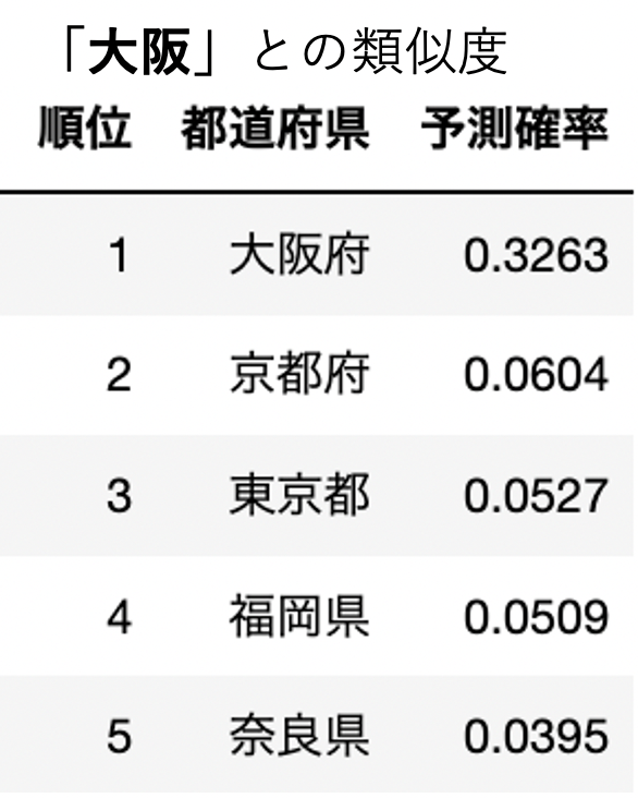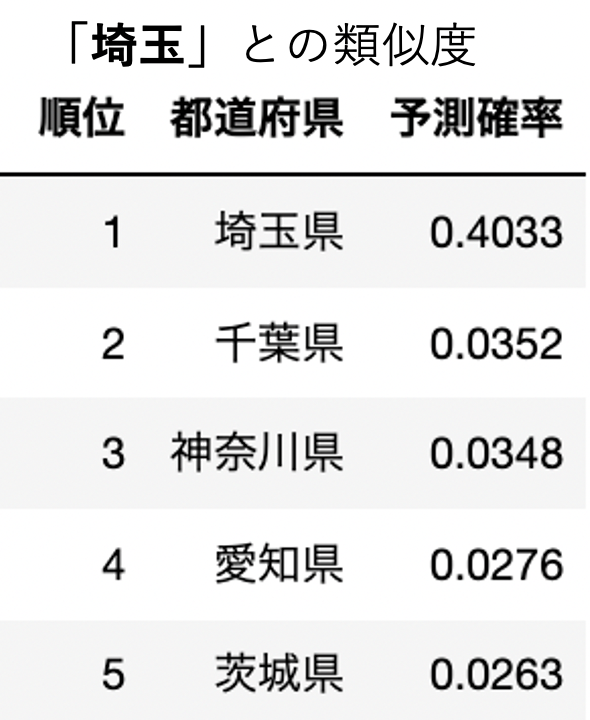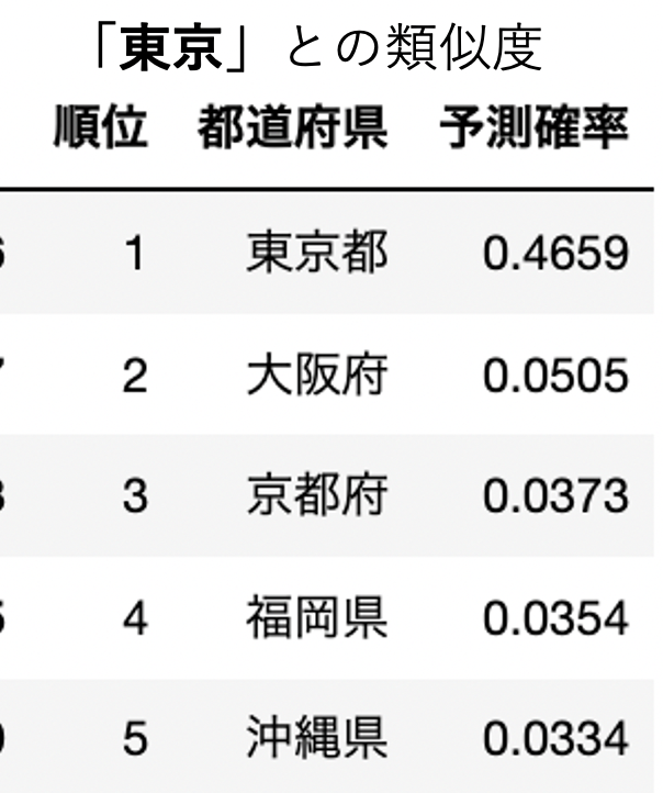 実際に上記の方法で各都道府県の類似度を上から並べてみた結果です。(ここでは予測確率が類似度を表します。)