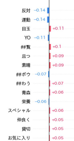 解釈は難しいですが、目玉、素晴、スペシャル、お気に入りなどはポジティブに影響していそうですね。