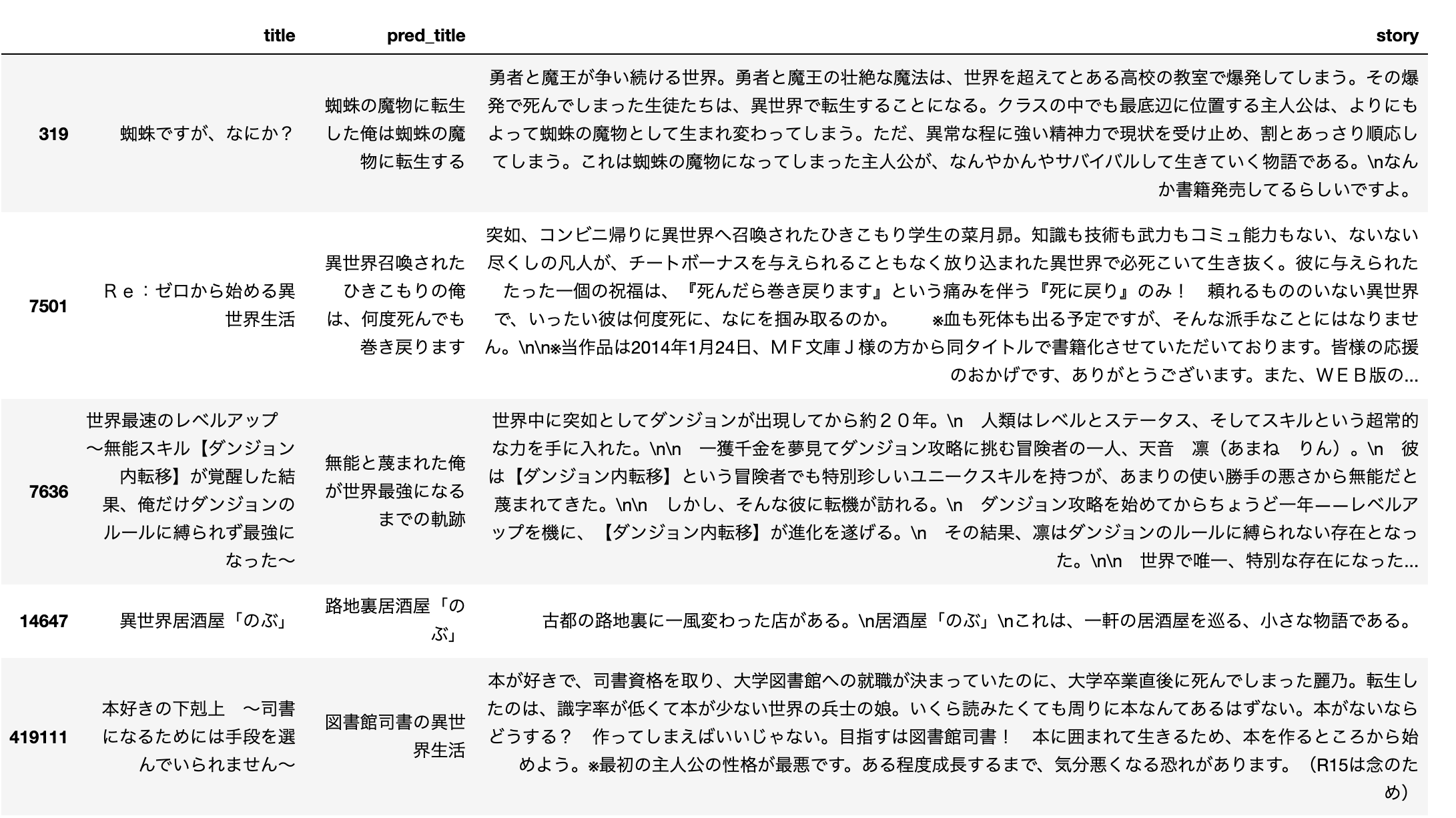 T5を用いて、なろう小説のstory(あらすじ)からtitle(タイトル)を予測するモデルを作成します。