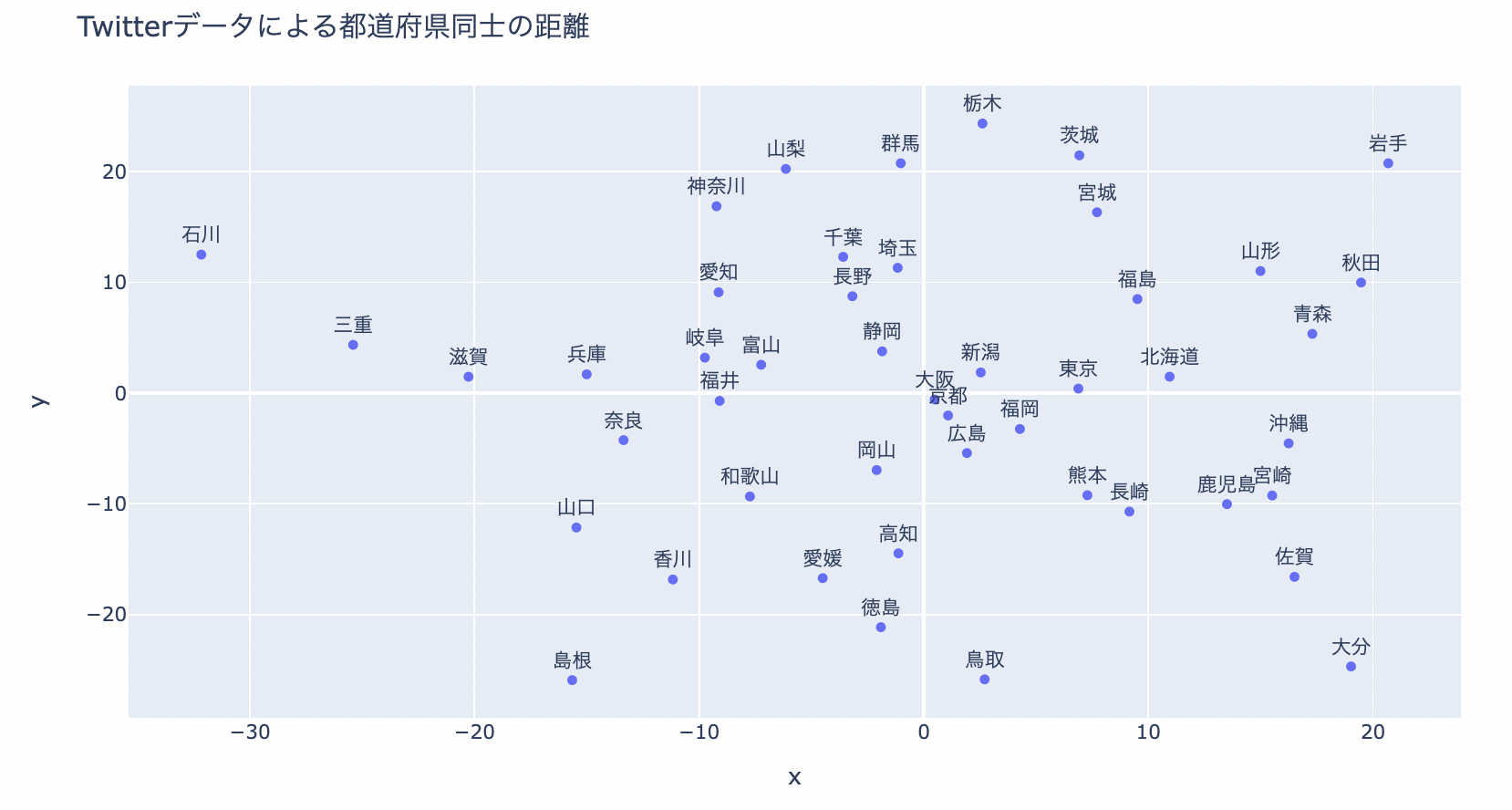 ということで、Twitterから都道府県のツイートを取得し、各都道府県の類似度を計算してみました。