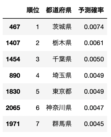 実際に上記の方法で各都道府県の類似度を上から並べてみた結果です。(ここでは予測確率が類似度を表します。)