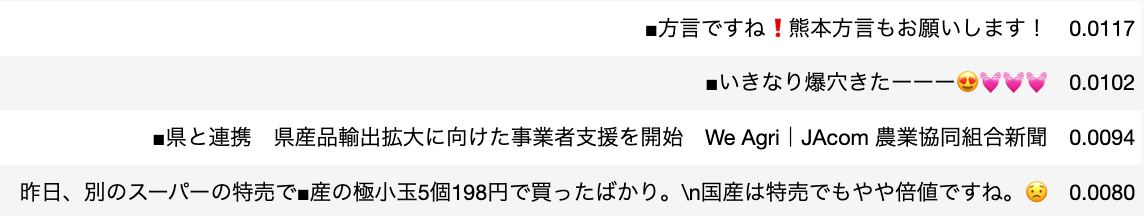 佐賀を茨城と予測した確率上位のツイートを見てみます。(本来は■に佐賀と入っているが、関東に絞った場合に茨城と予測しているツイートです。)
