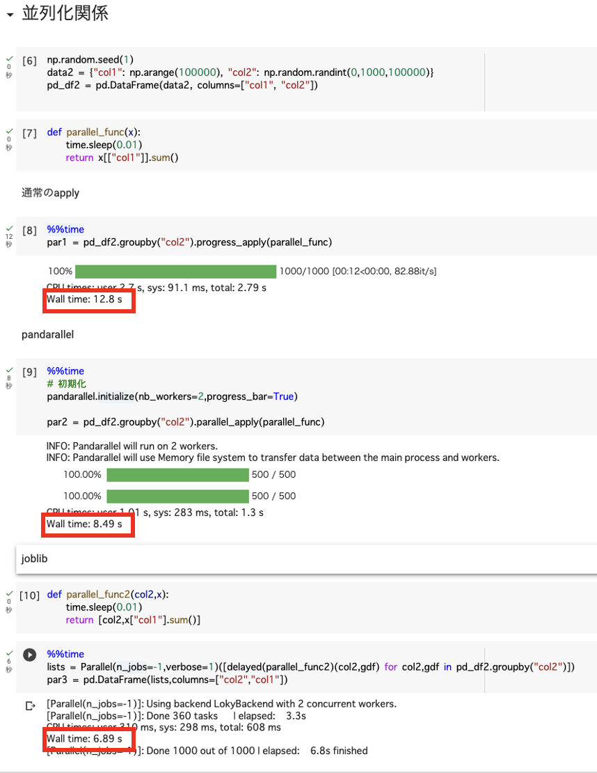 JoblibとpandarallelはJoblibの方が速そうですが、処理が多くなった時はどうかわかりません。 pandarallelは簡単にかけて可読性もよく、結果も見やすいので最近はpandarallelを使用してます。